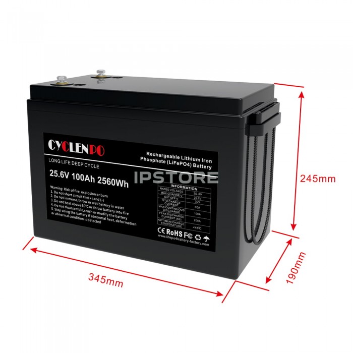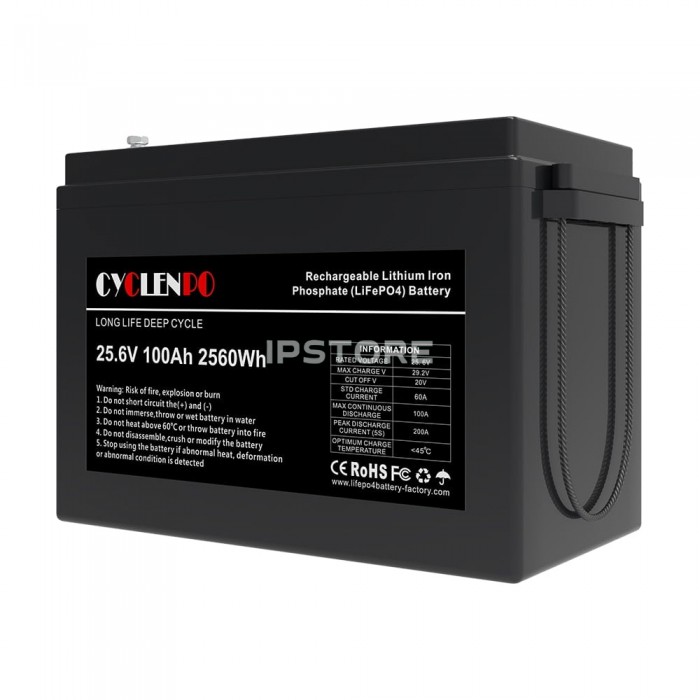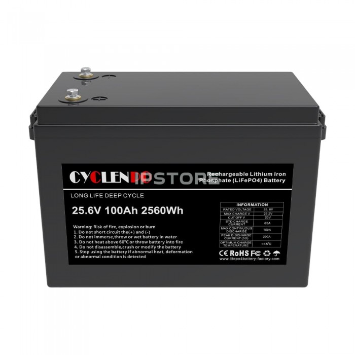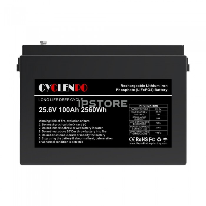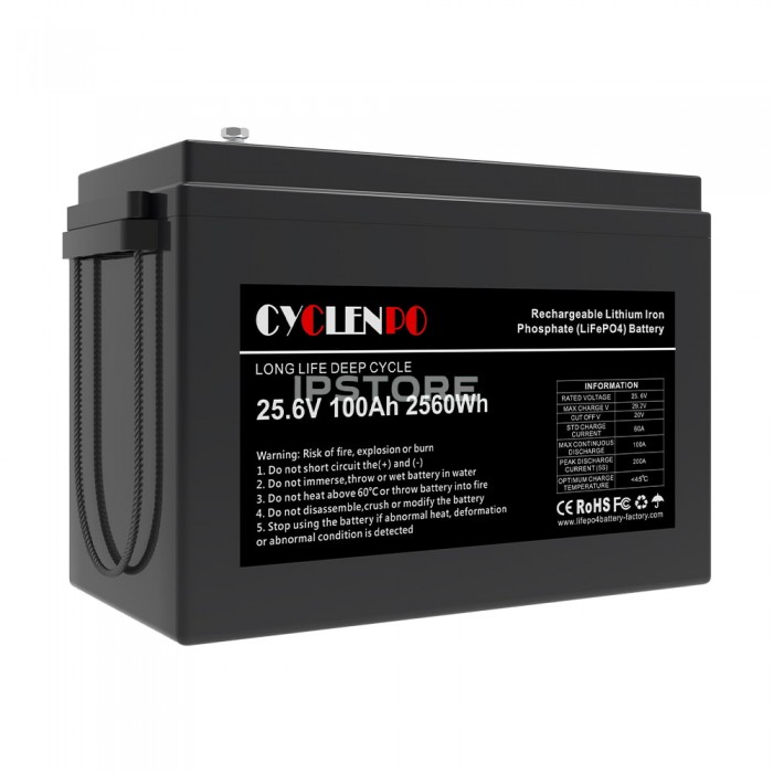 Аккумуляторная батарея Cyclen 25.6V 100AH LiFePo4 емкостью 100 Ач , с выходным напряжением 25.6 В , тип – литий-железо-фосфатная ( LiFePO4 ), количество циклов: > 6000.