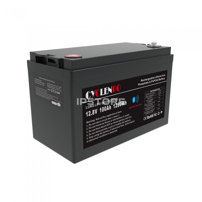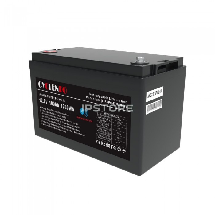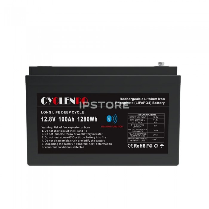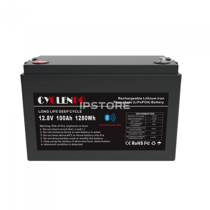 Акумуляторна батарея Cyclen 12.8V 100AH LiFePo4 (підігрів/Bluetooth) ємністю 100 Аг, з вихідною напругою 12.8 В, тип – літій-залізо-фосфатна (LiFePO4), кількість циклів: > 6000. Вбудована функція підігріву та Bluetooth.