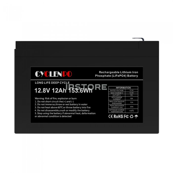 Акумуляторна батарея Cyclen 12.8V 12AH LiFePo4 ємністю 12 Аг, з вихідною напругою 12.8 В, тип – літій-залізо-фосфатна (LiFePO4), кількість циклів: > 3000.
