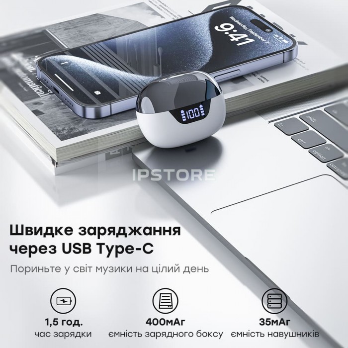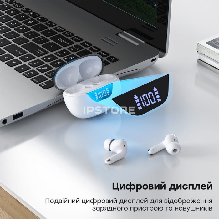 Бездротові навушники типу TWS із LED-дисплеєм, з підтримкою Bluetooth 5.3; дальність відтворення звуку до 12 м; функції шумозаглушення ANC та ENC; 4 вбудовані мікрофони; ємність акумуляторної батареї навушників 35 мА·рік...