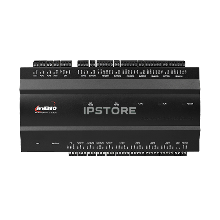 Контроллер InBio460 поддерживает двухдверный двухсторонний или четырехдверный односторонний контроль доступа. Позволяет подключить 8 внешних биометрических считывателей ZKTeco inBio/4 считывателя Wiegand.