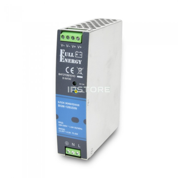 Блок живлення у металевому корпусі Full Energy BGM-126UDIN 12 В / 6.3 А для кріплення на DIN рейку, імпульсний.