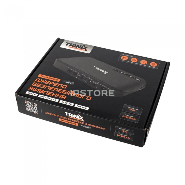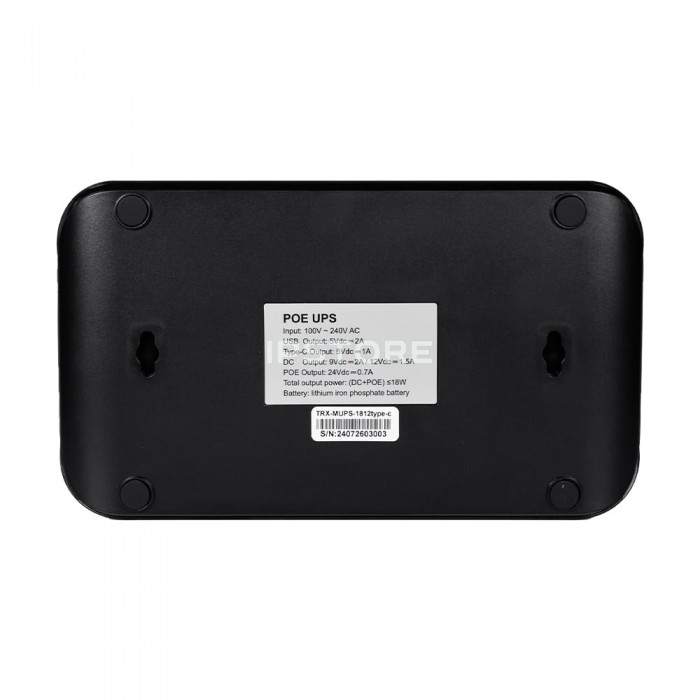 Миниатюрный источник бесперебойного питания Trinix TRX-MUPS-1812 Type-C (20000mAh LiFePo4) с четырьмя встроенными аккумуляторными батареями LiFePo4 емкостью 5000 мАч (общая емкость 20000 мАч/c, выходные DC, а) 5 В (USB) + 5 В (Type-C) + 9/12 В (DC) – переключается + 24 В (PoE) , выходное напряжение/ток каждого выхода: USB: 5В/2А, Type-C: 5В/1А, DC: 9В/2А, 12В/1.5А, PoE: Вт , входное напряжение AC 100-240 В/50-60 Гц.