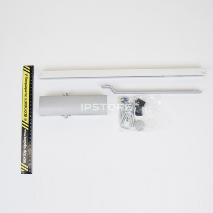 тело доводчика, стандартный рычаг, заглушка на шпиндель, крепежный комплект, монтажная инструкция, коробка