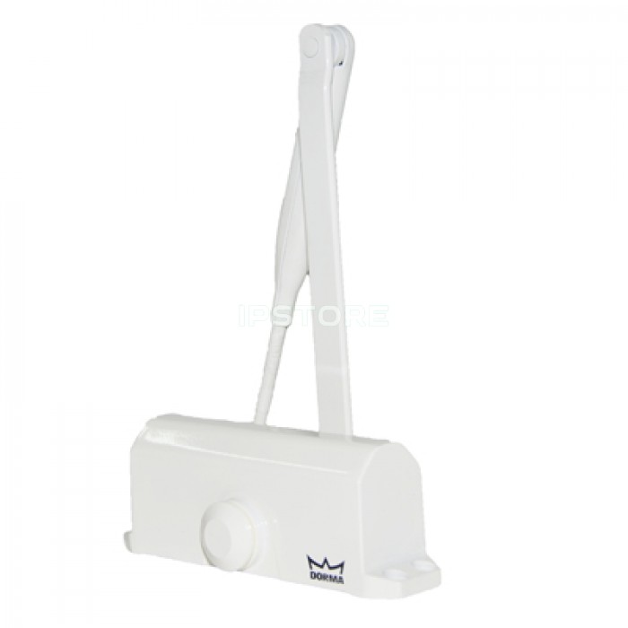 Дотягувач DORMA TS77 верхнього розташування, накладного монтажу, класичний, за технологією "шестерня-рейка". Колір - білий, зусилля - EN2. Макс. вага двері: 50кг (при ширині двері 900мм). Для стандартних та протипожежних дверей. Два незалежних діапазони регулювання швидкості закривання. Монтаж на полотно з боку петель або на коробку двері з протилежного боку. Універсальний для лівого і правого відкривання.