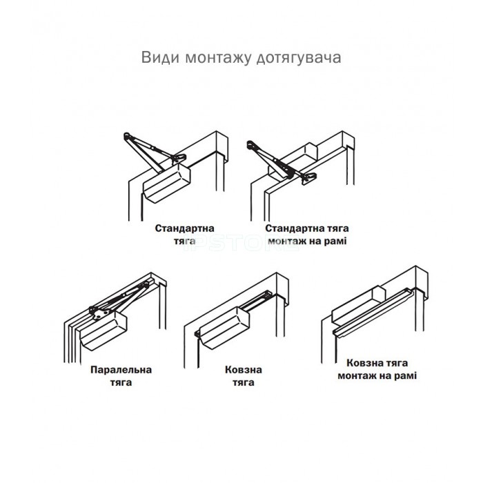 2. Со стороны закрывания дверей: корпус доводчика устанавливается на дверную раму, тяга на створку.