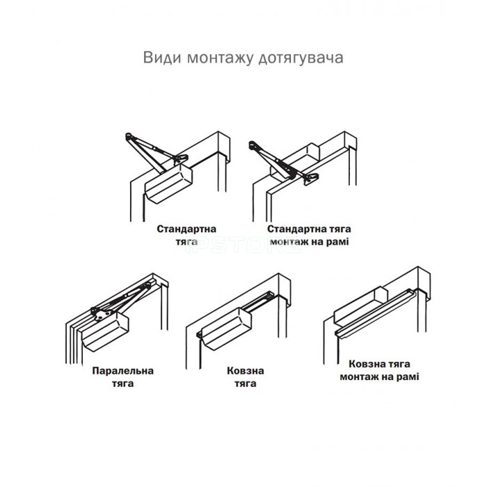 2. Со стороны закрывания двери: корпус доводчика устанавливается на дверную раму, тяга на створку.