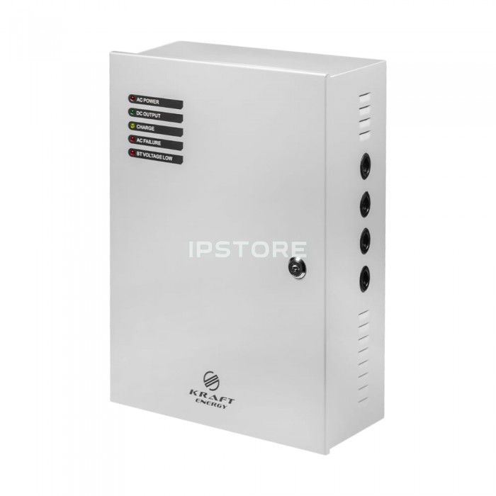Блок безперебійного живлення імпульсний Kraft PSU-2450LED з LED-індикацією, у металевому боксі з місцем під дві акумуляторні батареї 12В/18 Аг, номінальні вихідна напруга/струм 24 В/5 А, вхідна напруга 190-265 В.