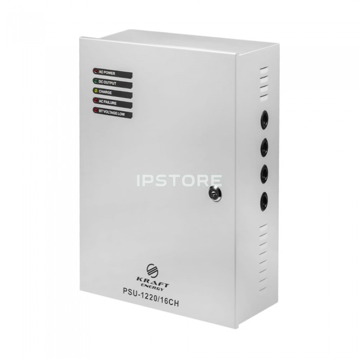 Блок безперебійного живлення імпульсний Kraft PSU-1210/16CH з 16 каналами навантаження, LED-індикацією, у металевому боксі з місцем під акумуляторну батарею 18 Аг, номінальні вихідна напруга/струм 12 В/10 А, вхідна напруга 190-265 В.Застосування Здійснює подачу резервного живлення для таких пристроїв як відеокамери, замки електронні, кодові клавіатури, зчитувачі, контролери, сирени, охоронні датчики та інші пристрої, які мають вхідну напругу 12 В.Ключові властивостіВхідна напруга 190-265, 50-60 ГцНомінальна вихідна напруга 12 В, вихідний струм номінальний 10 А, максимальний 12 АМісце під акумуляторну батарею 18 АгСтрум заряду акумуляторної батареї 1.75 АКількість каналів навантаження 16LED-індикаціяЗахист від: короткого замикання, підключення невірної полярності АКБ, глибокого розряду АКБ, тепловий захистМеталевий бокс з розмірами 295 / 195 / 90 ммЗамок+2 ключа..