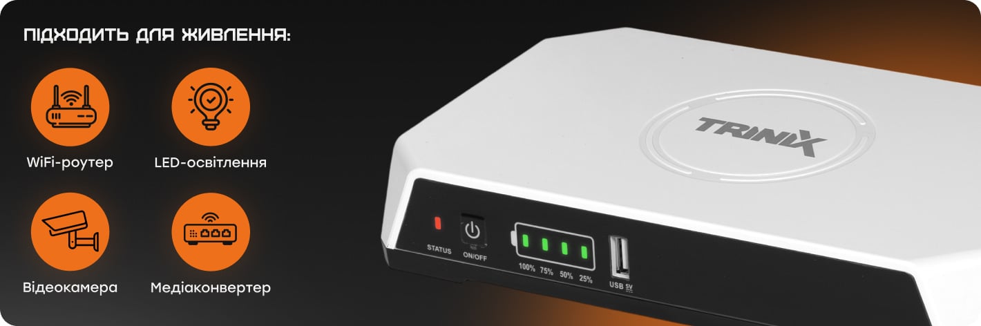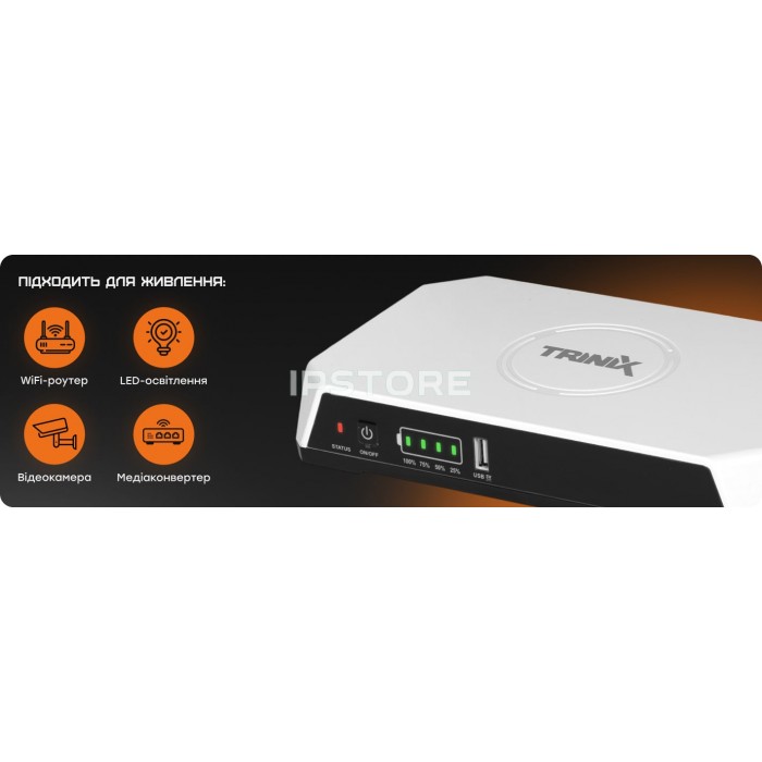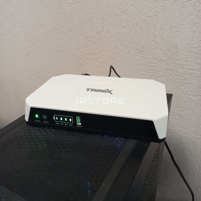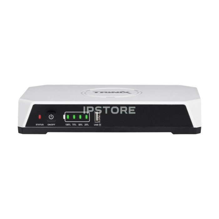 Мініатюрне джерело безперебійного живлення Trinix TRX-MUPS-3648PoE (20000mAh LiFePo4) з чотирма вбудованими акумуляторними батареями LiFePo4 ємністю 5000 мАч2 USB, DC *3, PoE, вихідна напруга 5 В (USB (DC3) + 24/48 В (PoE), вихідна напруга/струм кожного виходу: USB/DC1: 5В /3А, DC2: 9В/3А, DC3: 12В/3А, PoE: 24В/1А, 48В/0.5А, максимальна вихідна потужність 36 В2 Гц. обладнання при вимкненні електроенергії. Забезпечує живлення та безперебійну роботу таких пристроїв, як роутер, медіаконвертер, модем, відеокамери, LED-освітлення. Можна використовувати як повербанк завдяки USB-порту.