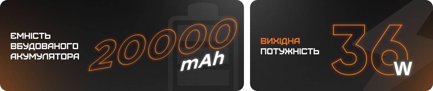 - Вбудовані 4 LiFePo4 акумуляторні батареї ємністю 5000 мАг (загальна ємність 20000 мАг).
