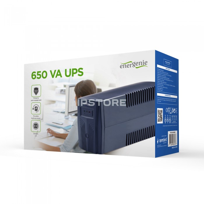 Джерело безперебійного живлення EnerGenie EG-UPS-B650 призначене для захисту побутової та офісної техніки від перепадів напруги та раптових відключень електроенергії. Лінійно-інтерактивна технологія з автоматичним регулятором напруги (AVR) забезпечує стабільне електроживлення навіть за істотних коливань у мережі. Потужність пристрою становить 650 В·А (390 Вт), що робить його ідеальним рішенням для персональних комп'ютерів, маршрутизаторів та іншого обладнання з помірним енергоспоживанням.