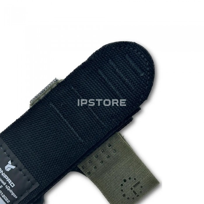 - Липучка-фіксатор, яка дає змогу накладати турнікет на широкий діапазон типорозмірів кінцівок і надійно зафіксувати стропу в необхідному стані (текстильна застібка із синтетичного волокна);