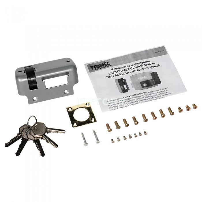 Электромеханический замок Trinix TRX Fass Iron (GR) из крашеной стали, тип установки по направлению закрывания дверей – правый, питание 12 В, 5 ключей в комплекте.