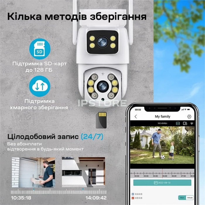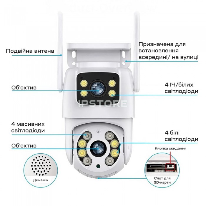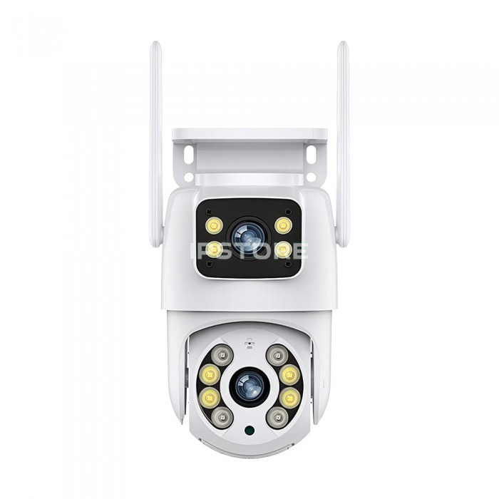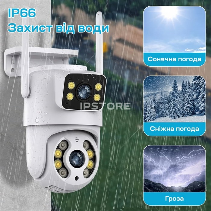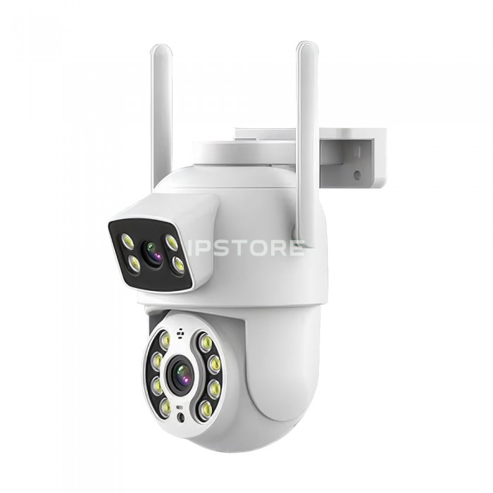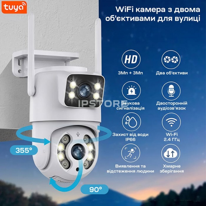 3Mp+3Mp вулична поворотна IP-відеокамера з підтримкою Wi-Fi (2.4 ГГц), з подвійним об’єктивом і подвійним підсвічуванням; об’єктив 3.6 мм + 3.6 мм; матриця 1/2.8″ CMOS x2; роздільна здатність запису 2048*1536 x2; кут повороту 0-355°, кут нахилу 0-90°; ІЧ-підсвічування до 20 м + LED-підсвічування до 20 м; віддалений моніторинг на смартфонах (застосунок Tuya); детекція руху, виявлення людини, автотрекінг; вбудований мікрофон та розмовний динамік; запис за детекцією на карту microSD (до 128 ГБ) або у хмару; живлення 5 В/1.5 А через інтерфейс USB Type-C; робоча температура -20°C~+55°C; клас захисту IP66; габаритні розміри 145 / 102 мм