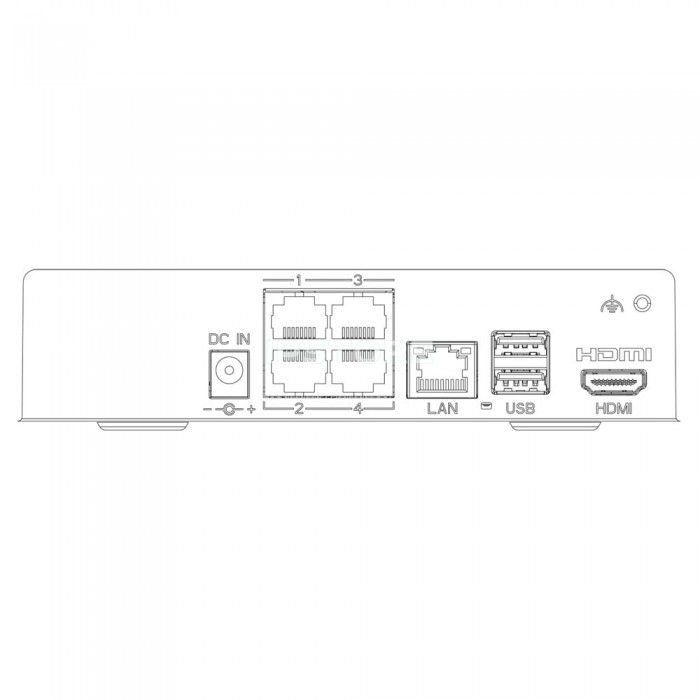 4-канальний мережевий відеореєстратор з 4 портами PoE, з максимальною роздільною здатністю 8MP; відеокодек H.265S, H.265+, H.265, H.264; запис: 8MP / 6MP / 5MP / 4MP / 3MP / 1080P / 960P / 720P @ 25fps; вхідний/вихідний потоки 40Mbps/64Mbps; перегляд архіву камер: локально/мережею 4/4; PoE-порти RJ45 100Mbps x4, загальна вихідна потужність 36 Вт; інтерфейси: мережа RJ45 100Mbps, USB 2.0 x2, HDD: SATA3.0 до 10 ТБ; живлення DC 48В/1А; розміри 202 / 202 / 42.5 мм