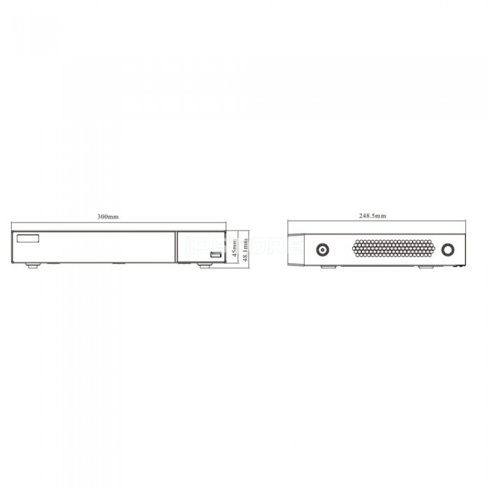 8-канальний мережевий відеореєстратор з підтримкою інтелектуальної відеоаналітики, з максимальною роздільною здатністю 16MP; відеокодек H.265+, H.265S, H.265, H.264; запис: 16MP / 12MP / 8MP / 6MP / 5MP / 4MP / 3MP / 1080P / 960P / 720P @ 25fps; вхідний/вихідний потоки 192Mbps/192Mbps; відеовихід: HDMI (4K), VGA (Full HD); аудіо: вхід RCA x1 / вихід RCA x1; тривожні: входи 8/виходи 4; база даних облич: 32 бібліотеки/10000 фото облич, порівняння облич: 18 зображень/сек; перегляд архіву камер: локально/мережею 8/8; мережа: RJ45 1000Mbps x2, USB 2.0 x2, USB 3.0 x1, HDD: SATA x1 до 10 ТБ; живлення DC 12V/2А; розміри 300 / 248.5 / 48.1 мм