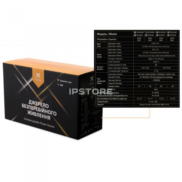 Источник бесперебойного питания Vinga VPC-600MU 600ВА / 360 Вт с LCD-дисплеем с USB в металлическом корпусе
