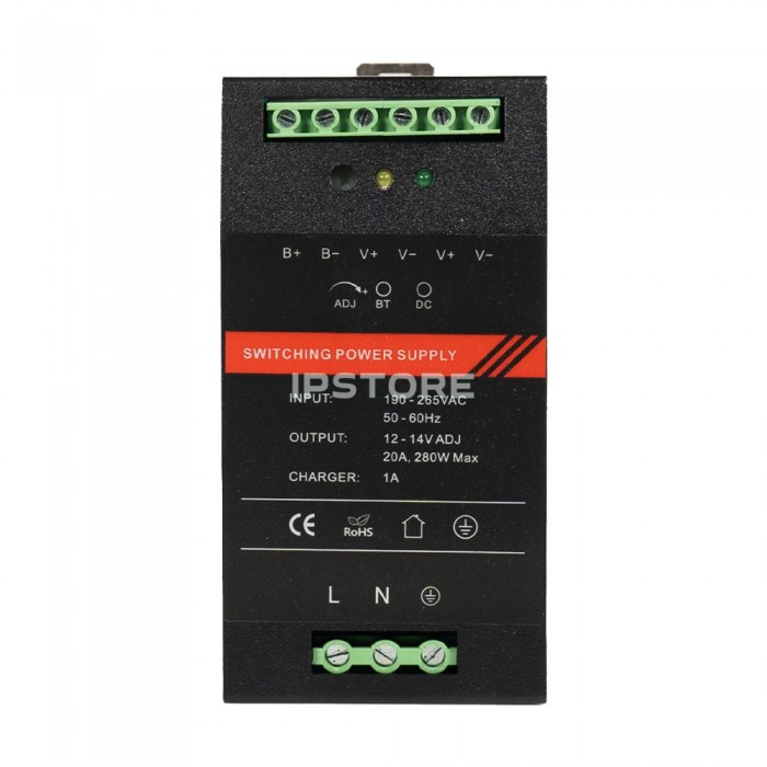 Блок бесперебойного питания импульсный Kraft PSU-1220DIN с LED -индикацией, с креплением на DIN -рейку, 2 канала нагрузки, номинальные выходное напряжение/ток 12 В /20 А, номинальная выходная мощность 280 Вт, входное напряжение 190-265 В,