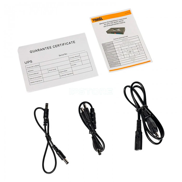 В комплекте сетевой кабель питания 220В для миниДБЖ длиной 80 см, кабель питания DC-DC длиной 40 см с разъемами, разветвитель питания DC-2 DC длиной 30 см с разъемами.