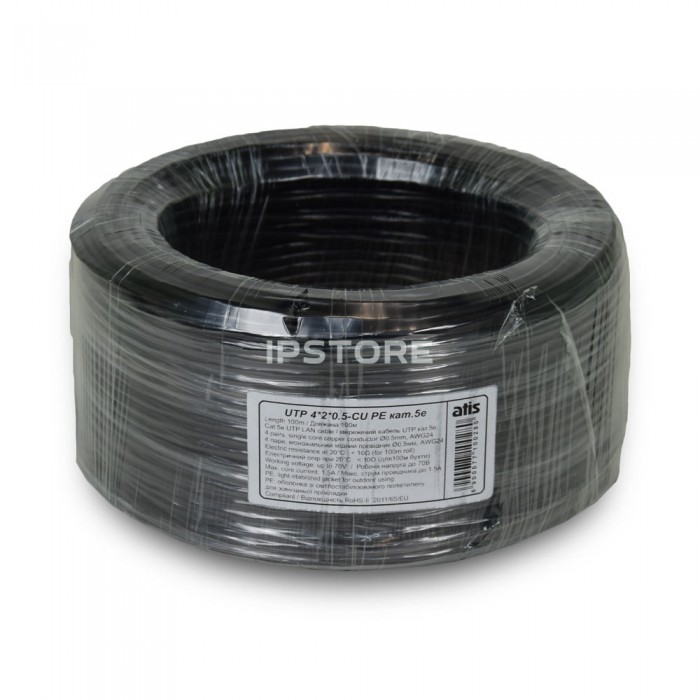 Кабель вита пара ATIS UTP 4×2×0.5-CU PE кат.5e бухта 100 м призначений для побудови мереж передачі даних і підключення обладнання в системах відеоспостереження, інтернет-мережах та інших слабкострумових системах. Вик...