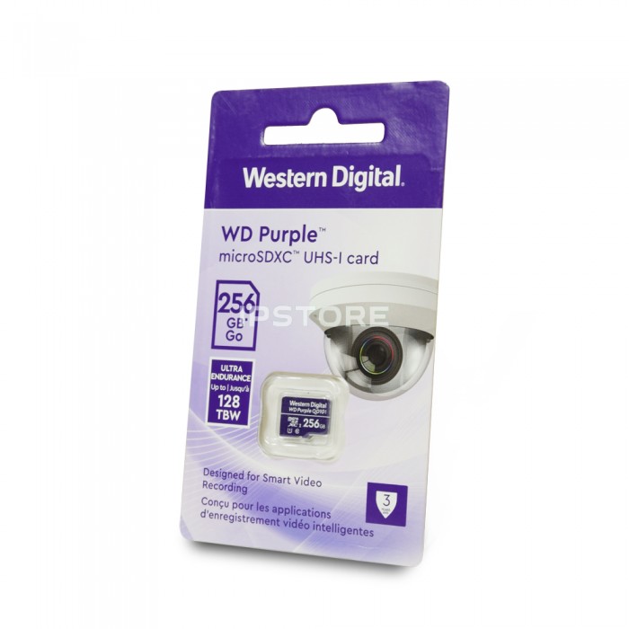 Карта пам'яті для відеонагляду MICRO SDXC 128GB UHS-I WDD128G1P0C WDC підвищеної стійкості. Карта використовується як змінний носій для пристроїв відеоспостереження, включаючи розумні камери охоронних систем. Розрахована на роботу в режимі 24x7 і уможливлює тривалий запис навіть у разі непередбаченого відключення від сервера.