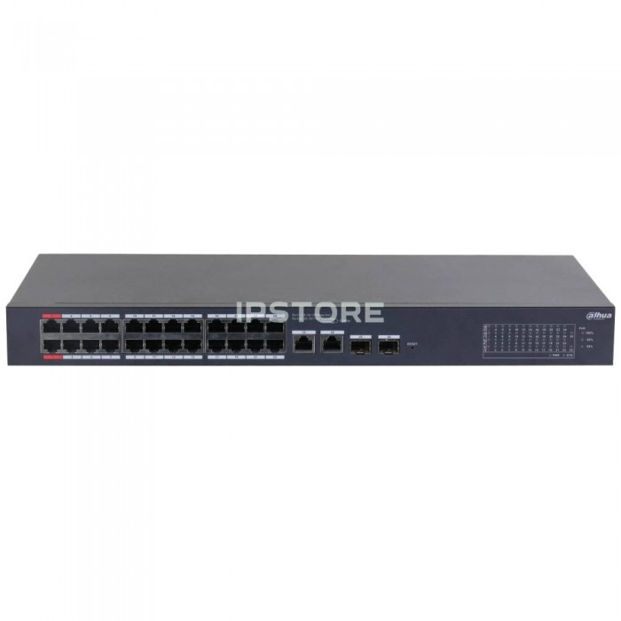 24 порти: 10/100Mbps PoE; 2 Combo порт 1000Mbps Uplink/SFP