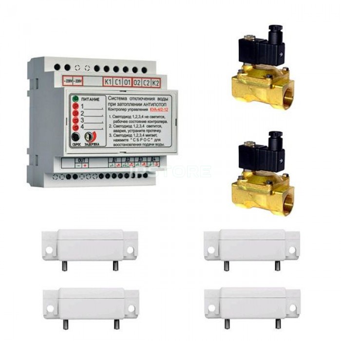 Комплект антизатоплення Економ NC 3/4 включає: контролер керування – 1шт.; датчик затоплення – 4шт.; електромагнітний клапан NC 3/4" – 2шт.