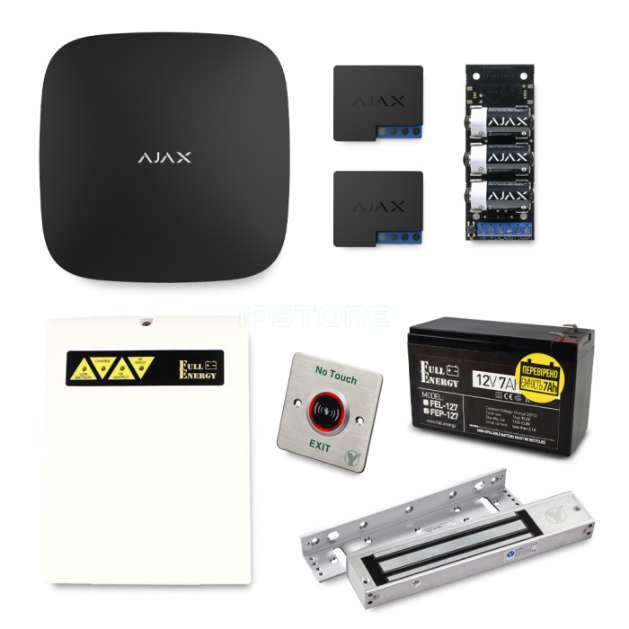 Централь Ajax Hub black – 1 шт, Бездротове реле Ajax Relay – 2 шт, Бездротовий модуль Ajax Transmitter – 1 шт, Блок безперебійного живлення Full Energy BBGP-123 – 1 шт, Акумулятор 12В 7 А⋅год для ДБЖ Full Energy 1 шт, Кнопка виходу Yli Electronic ISK-841C – 1 шт, Кутник монтажний MBK-280NL на вузькі двері – 1 шт, Електромагнітний замок YM-280N – 1 шт