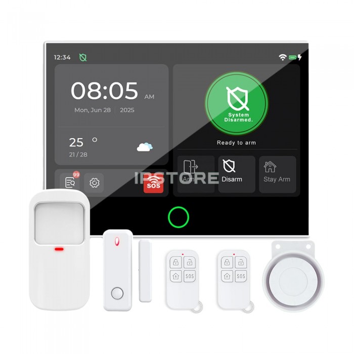 Комплект бездротової сигналізації з підтримкою WiFi 802.11 b/g/n (2.4 ГГц) та 4G LTE Cat-1, з віддаленим керуванням з мобільного застосунку Tuya, робоча частота 433 МГц. До комплекту входять: охоронна централь (хаб) з сенсорним екраном 7" та вбудованою сиреною, ІЧ-датчик руху, датчик відчинення вікон/дверей, 2 пульти дистанційного керування, зовнішня сирена. Можливості підключення: до 100 бездротових датчиків, 10 пультів керування, сирена. Сповіщення та дзвінок про тривогу надходять на 5 телефонів користувачів. Живлення DC 5 В через USB Type-C, резервна літієва акумуляторна батарея 3.7 В 5000 мА·год