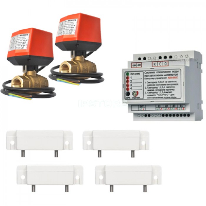 Комплект для квартири з використанням кульових кранів з електроприводами (сервомоторами): контролер керування ККА-4/4-С, 2 кульових крана з сервоприводом 632F+M6A2, 4 датчики затоплення Akvarate...