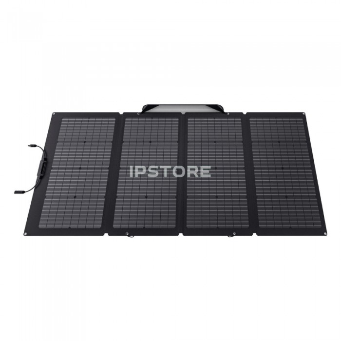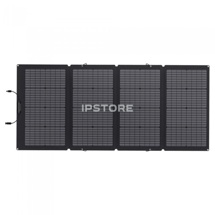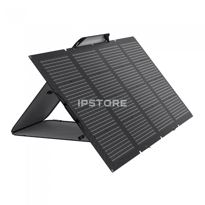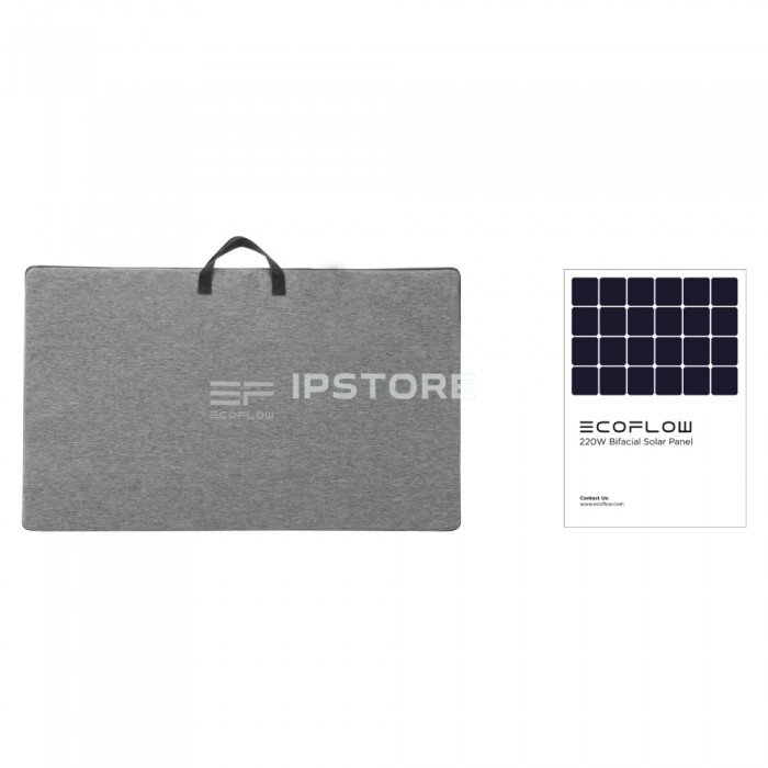 - Двостороння EcoFlow 220W Solar Panel складається з ефективних монокристалічних кремнієвих елементів. Номінальна потужність переносної сонячної панелі з основного боку 220 Вт та зі зворотного 155 Вт