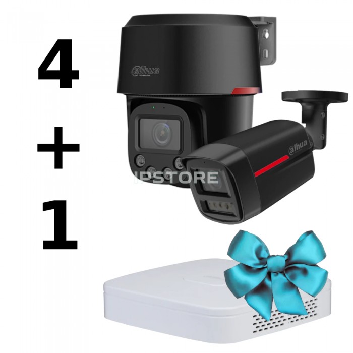 Dahua WIZCOLOR KIT 4+1 (black) — професійний комплект IP-відеоспостереження на базі технологій WizColor та WizSense, призначений для цілодобового контролю контролю території з інтелектуальною відеоаналітикою. Комплект забезпечує високу деталізацію зображення, активне стеження за об'єктами та надійний запис відеоархіву. До складу комплекту входять: 2 поворотні PT-камери Dahua DH-SD2C400NA-B-PV-PRO-BE (4 Мп) DH-IPC-HFW2849TL-S-PRO-BE (8 Мп, 2.8 мм) та мережевий відеореєстратор Dahua DHI-NVR2104-I2, які об'єднують усі пристрої в єдину інтелектуальну систему відеоспостереження.