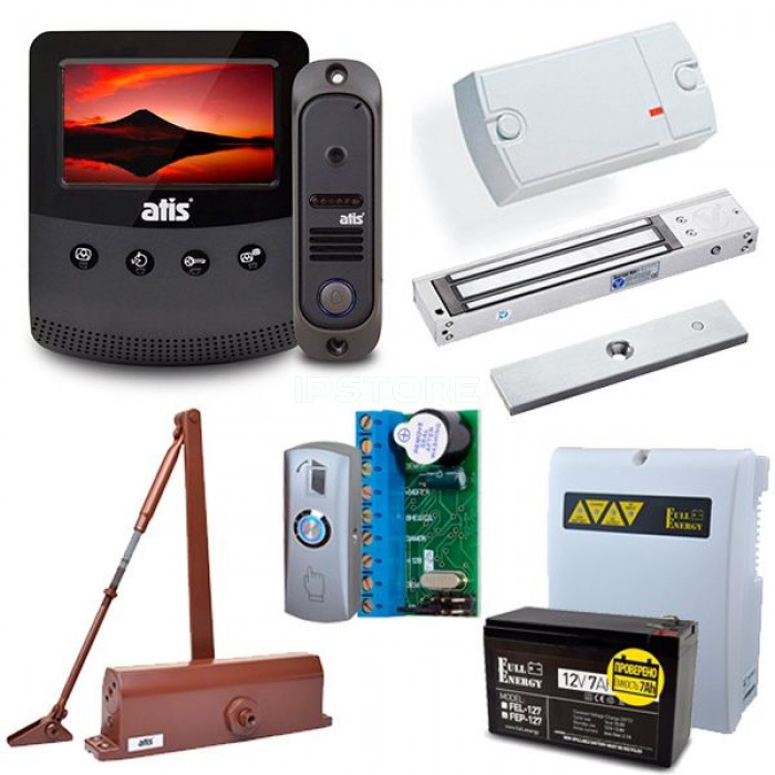 Комплект контролю доступу №001 включає: комплект відеодомофон+панель виклику, електромагнітний замок і монтажний куточок до нього, дотягувач дверей, автономний контролер, кнопка виходу, карта доступу – 20 шт., блок безперебійного живлення, акумулятор.