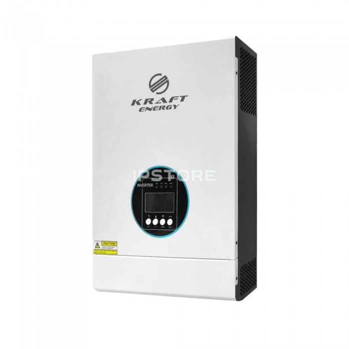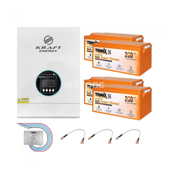 Комплект резервного живлення: гібридний інвертор на 5kW Kraft + 4 шт. АКБ 12В 12В 200Аг Trinix TGL12V200Ah/20Hr GEL Super Charge. Гібридний високочастотний однофазний інвертор; максимальна потужність 5 кВт, максимальна короткочасна потужність 10 кВт; правильна синусоїда на виході 220 В; вбудований MPPT-контролер та мережевий зарядний пристрій; максимальний струм заряду 80 А; вхідна напруга 90-280 В; діапазон напруги від сонячних панелей 120-430 В, макс. потужність 5500 Вт; ККД 94%; вихідна напруга 220 В ±5%; вихідна частота 50/60 Гц; напруга акумуляторної системи 48 В; час перемикання на АКБ 10 мс; функція «холодного» пуску; захист від розряду та перезаряду АКБ, перевантаження, перегріву, короткого замикання; робоча температура 0 °C ~ +50 °C; розміри 110 / 300 / 450 мм, вага 7.8 кг. Акумуляторна батарея гелева (GEL) Super Charge з підвищеною потужністю і вагою 66 кг; ємність 200 Аг, вихідна напруга 12 В; розміри 269 / 521 / 233 мм – 4 шт. Акумуляторний балансир для вирівнювання заряду чотирьох послідовно з'єднаних 12 В акумуляторних батарей або декількох паралельних ланцюгів послідовно з'єднаних акумуляторів; сумісність: свинцево-кислотні, гелеві, літій-залізо-фосфатні акумуляторні батареї. Балансування: струм 0-5 А, напруга 10-15 В. Світлодіодна індикація режиму роботи; розміри 99 / 71 / 18 мм; вага 360 г. Кабель / перемичка для з’єднання акумуляторних батарей; довжина 30 см; дріт мідний ПВ-3 перерізом 10 мм2; клеми М8 – 3 шт.