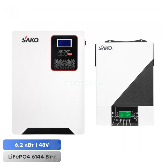 Комплект резервного живлення Sako: гібридний інвертор 6.2 кВт SUNON IV 48В +120A MPPT і акумуляторна батарея 51.2В 6144Втг Li-Sun series LiFePo4. Автономний однофазний інвертор для сонячних панелей; максимальна потужність 6.2 кВт, максимальна короткочасна потужність 12.4 кВА; правильна синусоїда на виході 220 В; вбудований MPPT-контролер та мережевий зарядний пристрій; максимальний струм заряду 120 А; вхідна напруга 90-280 В; діапазон напруги від сонячних панелей 60-450 В, макс. потужність 6000 Вт; ККД 93%; вихідна напруга 230 В ±5%; вихідна частота 50/60 Гц; напруга акумуляторної системи 48 В; час перемикання на АКБ 15 мс; підтримка заряду АКБ типу AGM/GEL/LiFePo4/Li-ion; вбудований локальний WiFi – лише для моніторингу з мобільного застосунку; знімний LCD-дисплей; функція «холодного» пуску; режим підмішування; захист від перевантаження, короткого замикання, перегріву; робоча температура 0°C~+50°C; розміри 481 / 300 / 130 мм, вага 13 кг. Настінна літій-залізо-фосфатна акумуляторна батарея для системи накопичення енергії; напруга 51.2 В; ємність 120 Аг, потужність 6144 Втг; максимальний струм заряду/розряду 50 А/100 А; ресурс: 6000 циклів заряджання-розряджання; комунікаційні порти CAN, RS485; клас захисту IP20; в одну систему можна підключити до 15 акумуляторних модулів; розміри 641 / 389 / 179 мм; вага 54.5 кг