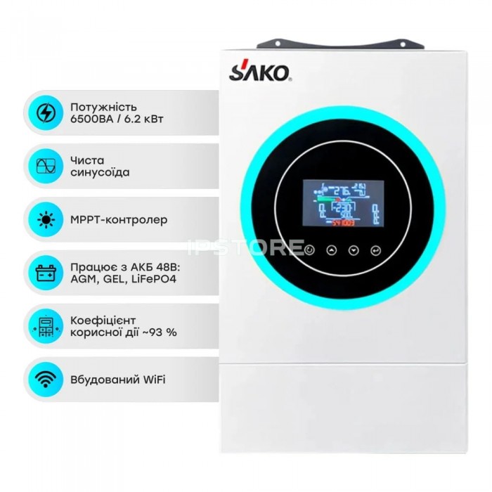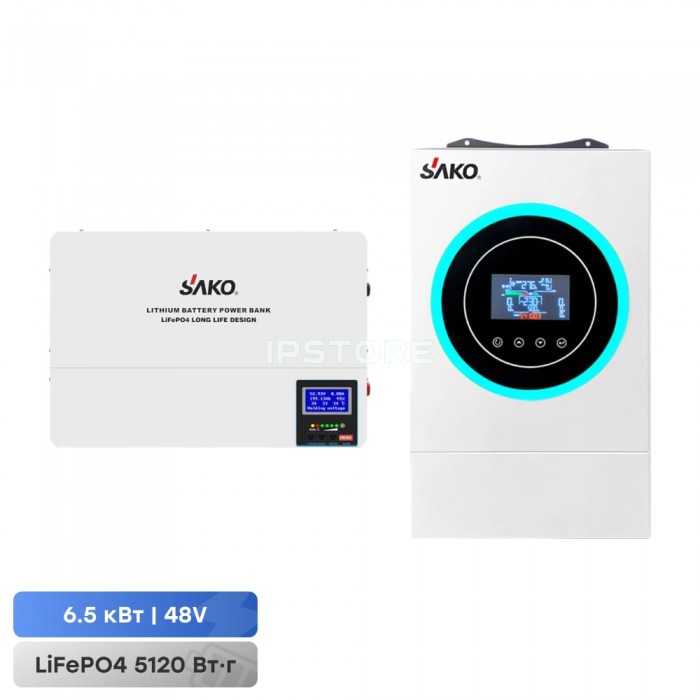 Meta Keywords Комплект резервного живлення Sako: гібридний інвертор 6.5kVA/6.2kW SUNON V 48V+120A MPPT й акумуляторна батарея 51.2В 5120Втг Li-Wall series LiFePo4