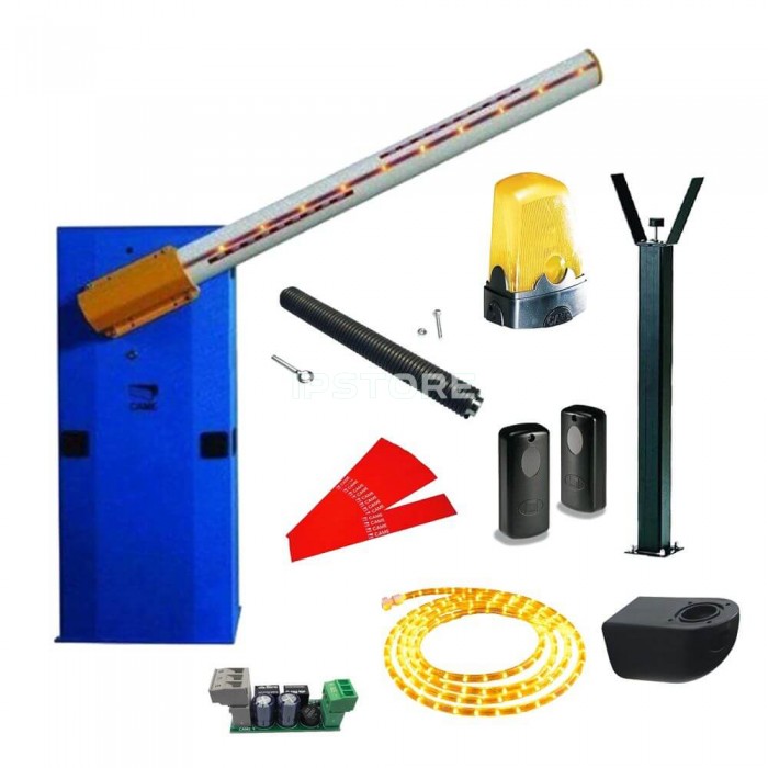 стойка шлагбаума со встроенной панелью управления, 2 круглые стрелы диаметром 100 мм и длиной 6.85 м, 2 пружины балансировки диаметром 50 мм, неподвижная стойка под стрелу, дюралайт LED длиной 13 м. (передатчик и приемник), сигнальная лампа 24 В и крепление для сигнальной лампы.