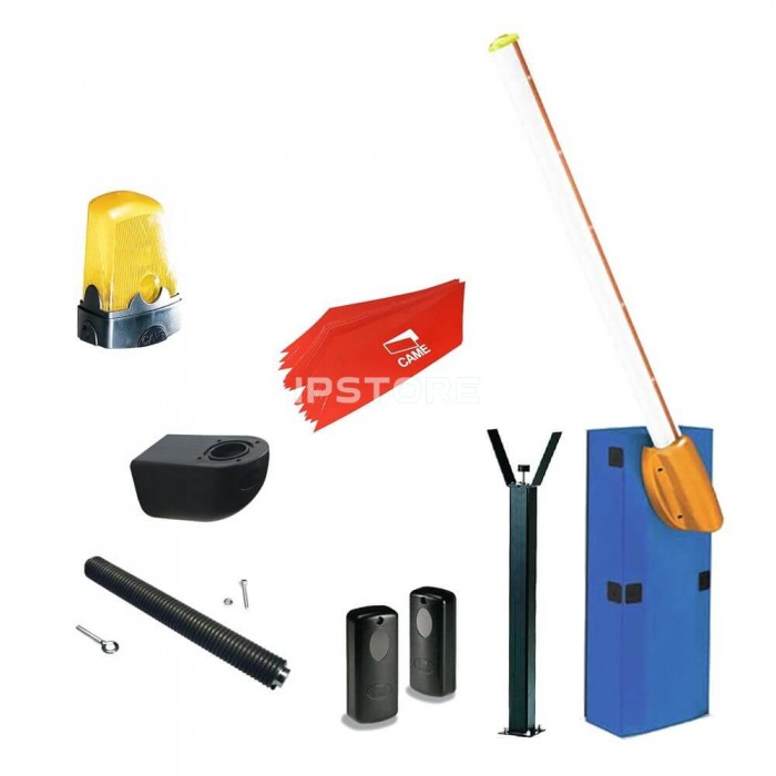 стойка шлагбаума со встроенной панелью управления, круглая стрела диаметром 100 мм и длиной 6.85 м, соединитель круглой стрелы, 2 пружины балансировки диаметром 50 мм, неподвижная стойка под стрелу, 14 наклеек на стрелу, комплект фотоэлементов (передатчик и приемник), сигнальная лампа 24 В и крепление для сигнальной лампы