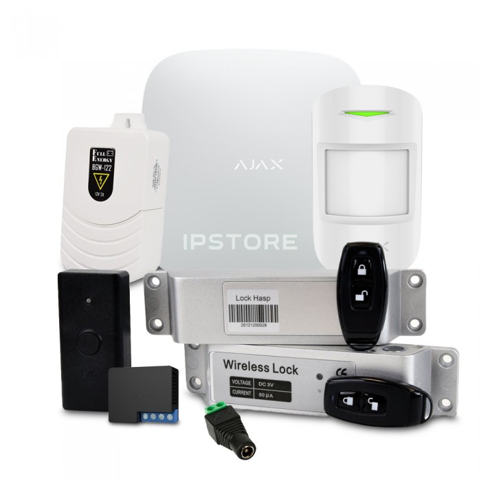 Комплект сигналізації із замком поєднує: бездротову централь Ajax Hub, бездротовий датчик руху Ajax MotionProtect white, бездротовий smart замок з копкою виходу та пультом ATIS SL-01, бездротове реле Ajax Relay, блок живлення BGW-122, роз'єм-power ATIS під затискач (мама)
