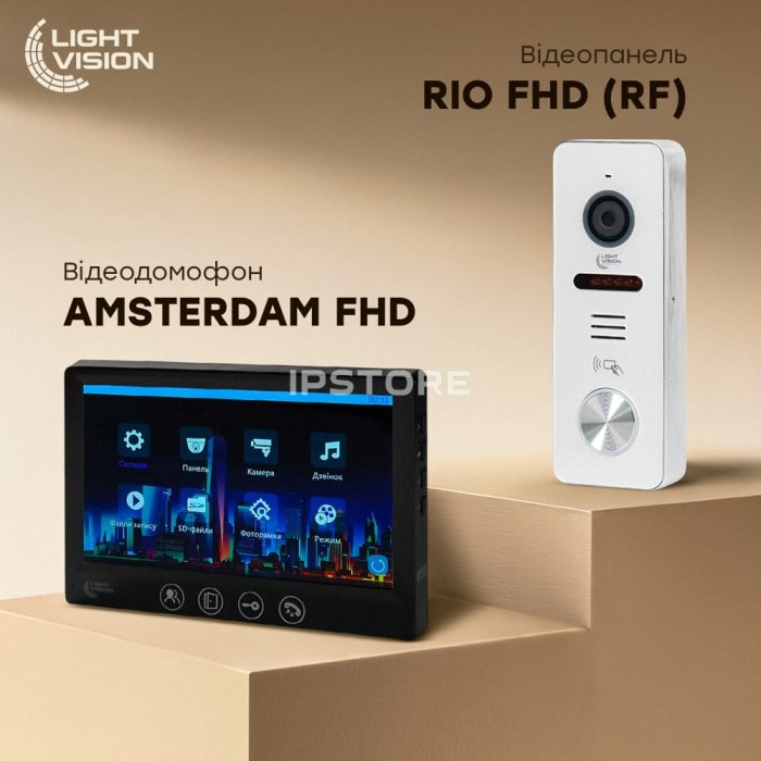 Комплект відеодомофону Light Vision з електрозамком: домофон 7" AMSTERDAM FHD Black, відеопанель 2Mp RIO FHD (RF) White зі зчитувачем Mifare, електромеханічний замок Trinix TRX Fass Steel