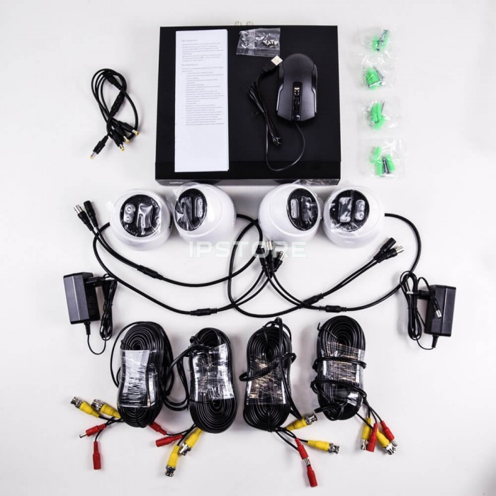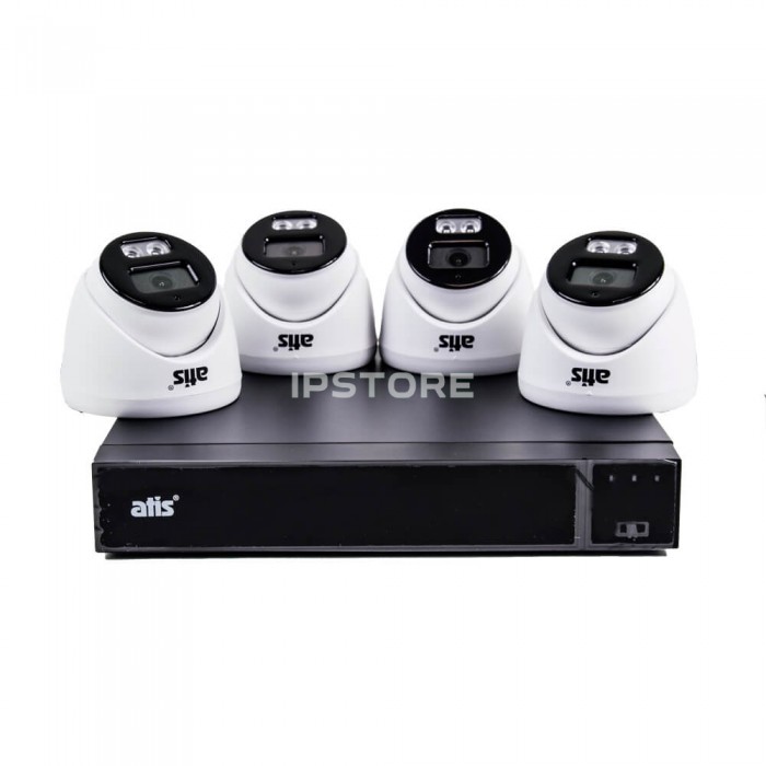 Комплект відеоспостереження ATIS kit 4 int містить: 1 відеореєстратор ATIS XVR 3104 (з USB-мишею та блоком живлення), 4 циліндричні зовнішні відеокамери ATIS AMD-2MIR-20W/3.6 Lite-S Full HD роздільної здатності, 2 адаптери живлення DC 12 В, 4 коаксіальні кабелі по 18 м, 1 кабель розгалужувач живлення.