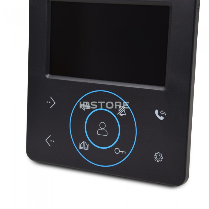 Состоит из цветного видеодомофона черного цвета с экраном 4 дюйма и сенсорными кнопками управления и цветной вызывной панели черного цвета с разрешением 1000ТВЛ и накладным способом установки. К домофону возможно подключить 2 панели вызова и 2 аналоговые камеры, поддерживается запись фото/видео, есть детектор движения на 1 канал, слот для карт памяти до 32ГБ.