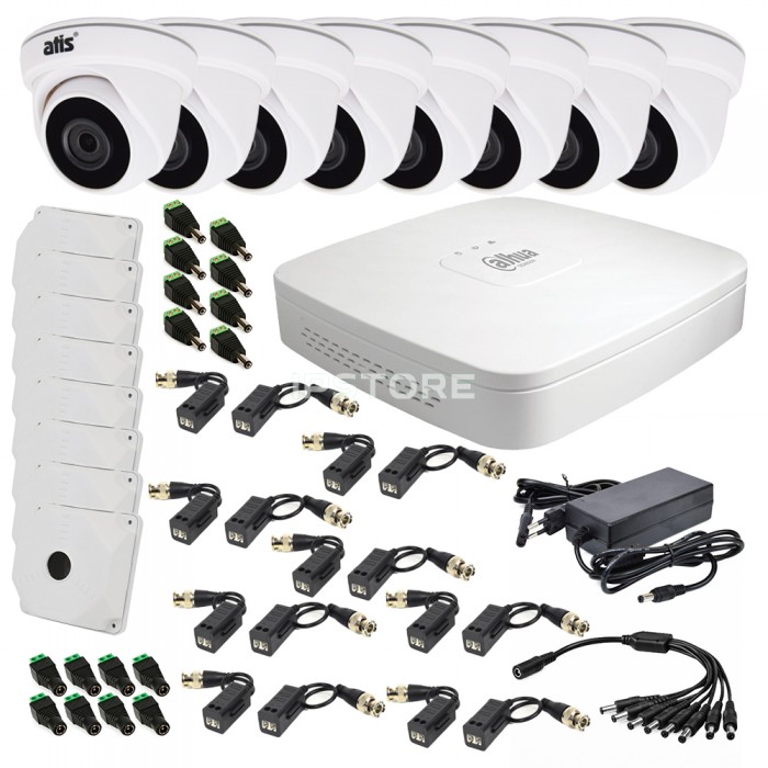 Комплект видеонаблюдения внутренний 2 Мп включает в себя XVR видеорегистратор 8-канальный Dahua DH-XVR4108C-I с AI функциями для систем видеонаблюдения, 8 MHD-видеокамер ATIS AMD-2MIR-20W/2.8 Lite, блок питания Full Energy BGP-125Lite 12 В/5 А, 8 коробок ATIS AB-Q130 (SP-BOX-130), 8 приемников-передатчиков ATIS AL-200 UHD (pair), разветвитель питания ATIS L8, 8 разъемов-power ATIS под зажим (мама), 8 разъема-power ATIS под зажим (папа).