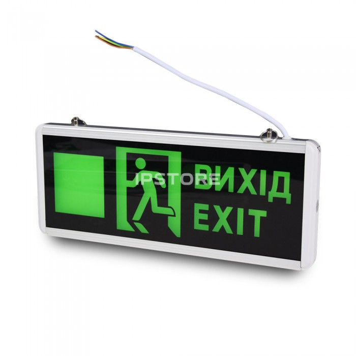 Комплект: 3 х Вказівників світлових LW-EM-UD-3W "Вихід" на акумуляторі для установки всередині приміщень. Табло вказівника висвітлюється за допомогою 4 або 6 зелених LED світлодіодів, що робить напис видимим у темний час доби.