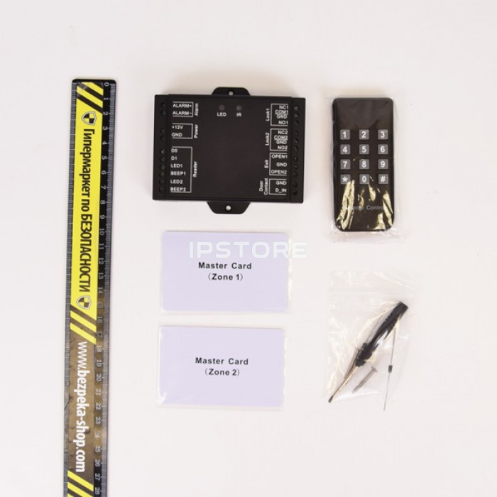 контроллер, пульт дистанционного управления, 2 мастер-карты, крепежный комплект, инструкция