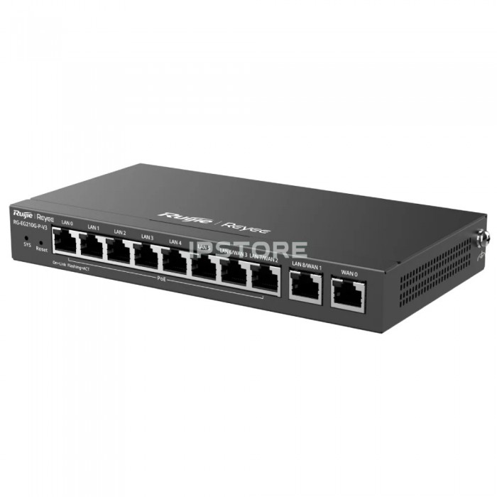 Маршрутизатор Ruijie Reyee RG-EG210G-P-V3 з 10 гігабітними портами, включаючи 8 з підтримкою технології PoE (Power over Ethernet), яка дозволяє передавати електроживлення та мережеві дані через один Ethernet-кабель.