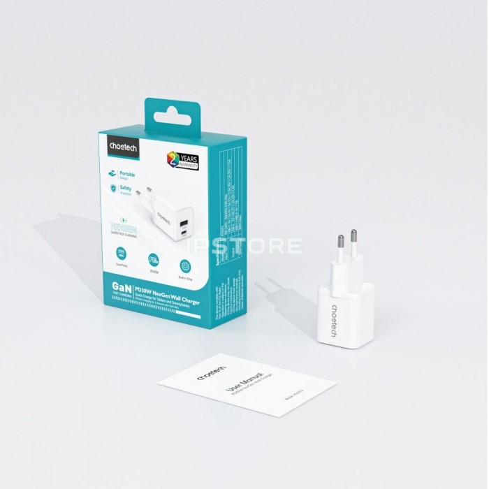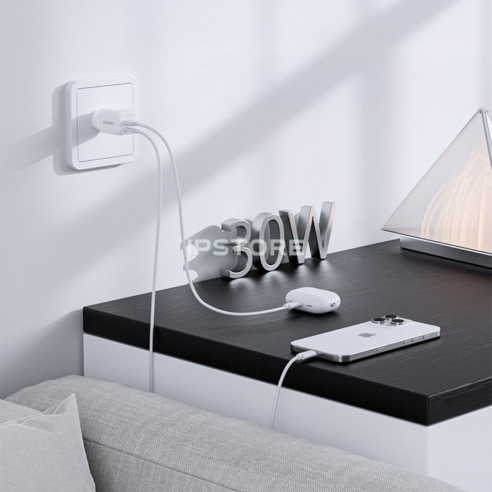 Мережевий зарядний пристрій (PD 35 Вт) з 2 USB-портами: USB-C та USB-A; вхідна напруга 100-240 В 50/60 Гц 1.2 А макс; вихід 1 USB Type-C: 5В/3А, 9В/3А, 12В/2.91А, 15В/2.33А, 20В/1.75А (35 Вт макс.); вихід 2 USB Type-A: 5В/3А, 9В/3А, 12В/2.5А, 20В/1.5А (30 Вт макс.); спільний вихід (USB Type-A + USB Type-C) 5В/3.4А (17 Вт макс.); дисплей для відображення стану заряджання; розміри 40 / 33 / 80 мм; вага 67.5 г