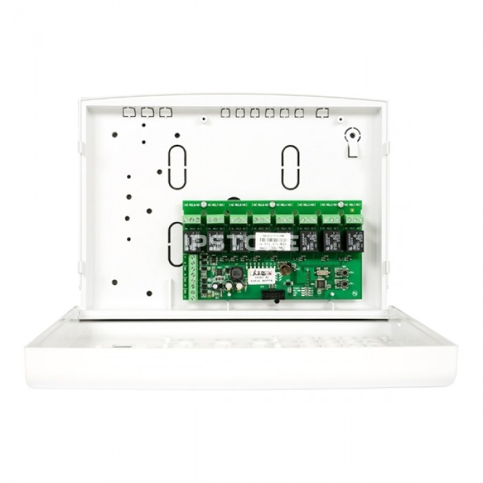Додає 8 релейних виходів в систему з можливістю їх винесення від ППК на відстань до 1000 м. Це буде корисним для підключення автоматики в віддалених частинах об'єкту - інший поверх, інша будівля тощо. Таким чином можна зменшити кількість дротів та оптимізувати топологію системи.
