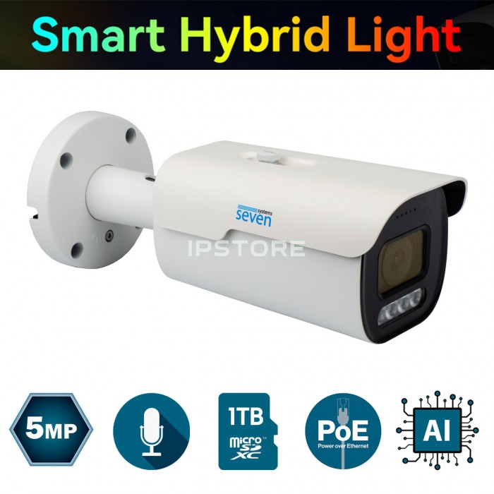 SEVEN IP-7245PA-DLMV — цилиндрическая 5-мегапиксельная моторизированная вариофокальная IP-видеокамера со встроенным микрофоном, слотом для карт памяти MicroSD объемом до 1 ТБ и мощной интеллектуальной двойной подсветкой на 60 метров для ночного видения.